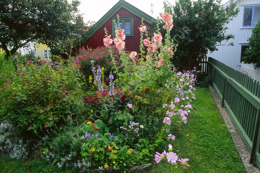 Baum, Bauwerk, Blume, Blumengarten, Blüte, Blütenstrauch, Bohuslän, Einfriedung, Flora, Garten, Gebäude, Haus, Holzhaus, Holzzaun, Kulturlandschaft, Lattenzaun, Malvengewächs, Möllesund, Orust, Pflanzenteil, Schweden, Stockmalve, Alcea rosea, Strauch, Västra Götlands län, Wilde Malve, Malva sylvestris, Zaun,
