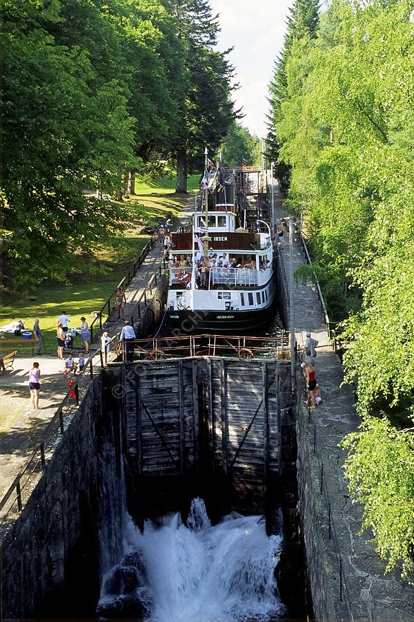 Ausflugsdampfer, Baum, Bauwerk, Dampfer, Fahrzeug, Flora, Gewässer, Kanal, Landschaft, Norwegen, Ort, Park, Person, Schiff, Schleuse, Schleusentor, Telemark, Telemarkkanal, Verkehrsmittel, Verkehrsweg, Vrangfoss, Wasserfahrzeug,