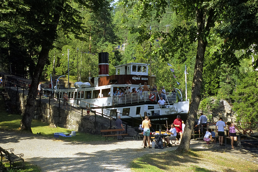 Ausflugsdampfer, Baum, Bauwerk, Dampfer, Fahrzeug, Flora, Gewässer, Kanal, Landschaft, Norwegen, Ort, Park, Person, Schiff, Schleuse, Telemark, Telemarkkanal, Verkehrsmittel, Verkehrsweg, Vrangfoss, Wasserfahrzeug,