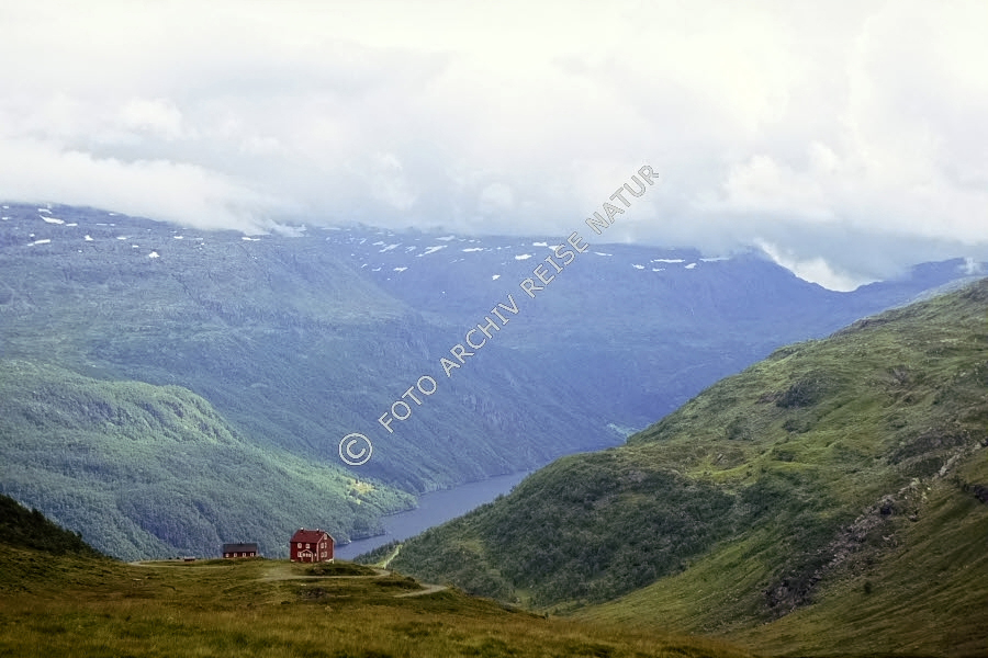 Bauernhof, Bauwerk, Bergkette, Bergmassiv, Fjell, Gebirge, Gebäude, Gewässer, Haus, Hof, Holzhaus, Hordaland, Landschaft, Norwegen, Røldalsfjell, See, Wald,
