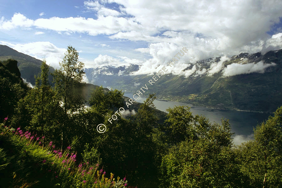 Baum, Fjord, Flora, Folgefonn, Gebirge, Gewässer, Gletscher, Hardangerfjorden, Hordaland, Landschaft, Lofthus, Nachtkerzengewächs, Norwegen, Person, Schmalblättriges Weidenröschen, Epilobium angustifolium, Sjørfjorden, Wald,