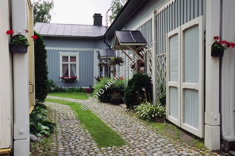Bauwerk, Blume, Finnland, Flora, Gebäude, Gebäudeteil, Haus, Holzhaus, Kopfsteinpflaster, Kulturlandschaft, Material, Rasen, Rauma, Stein, Tor, Tür, Westfinnland, Wiese,