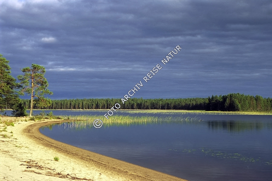 Finnland, Flora, Gewässer, Gras, Landschaft, Nationalpark, Nordkarelien, Ort, Ostfinnland, Patvinsuo, Patvinsuo Nationalpark, Sandstrand, Schilfrohr , Phragmites australis, See, Strand, Süßgras, Wald,