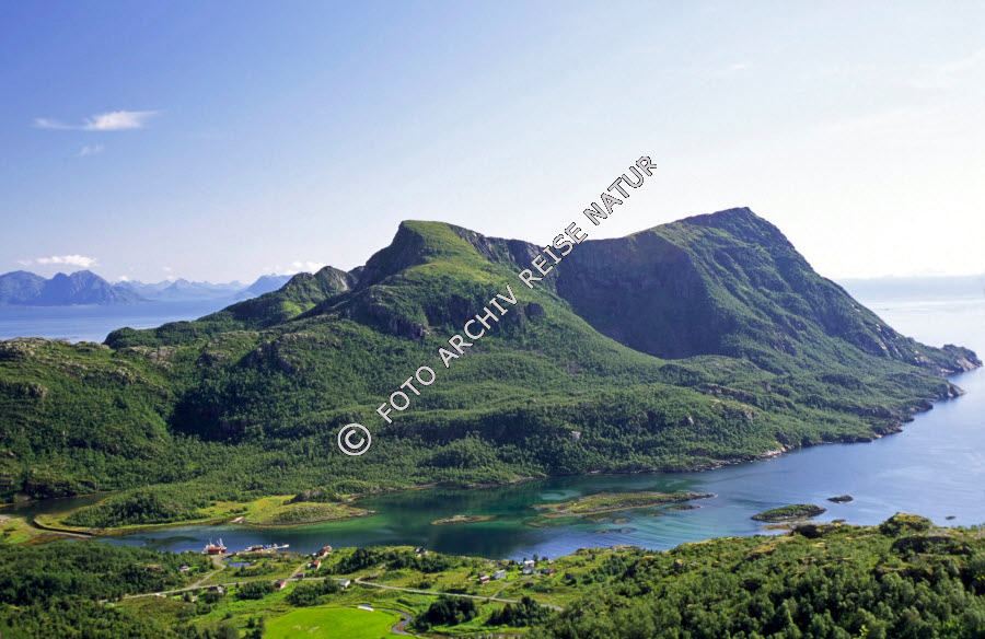 Digermulen, Dorf, Fjord, Gewässer, Hinnøya, Kulturlandschaft, Landschaft, Lofoten, Nordland, Norwegen, Sund, Süd-Hinnøy, Ulvågsund, Vestfjorden, Weiler,