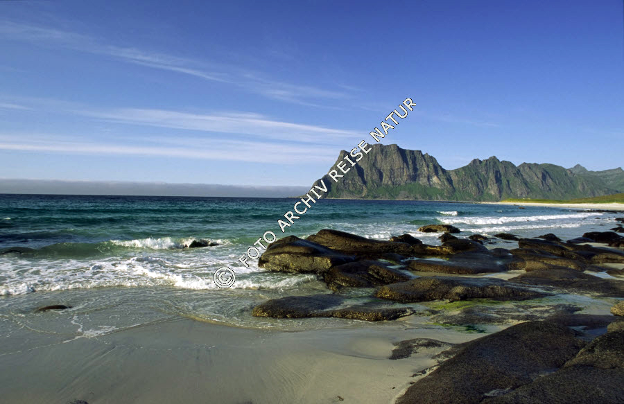 Berg, Bergkette, Felsenstrand, Gebirge, Gewässer, Landschaft, Lofoten, Meer, Nordland, Nordmeer, Norwegen, Sandstrand, Strand, Utakleiv, Vestvågøy,