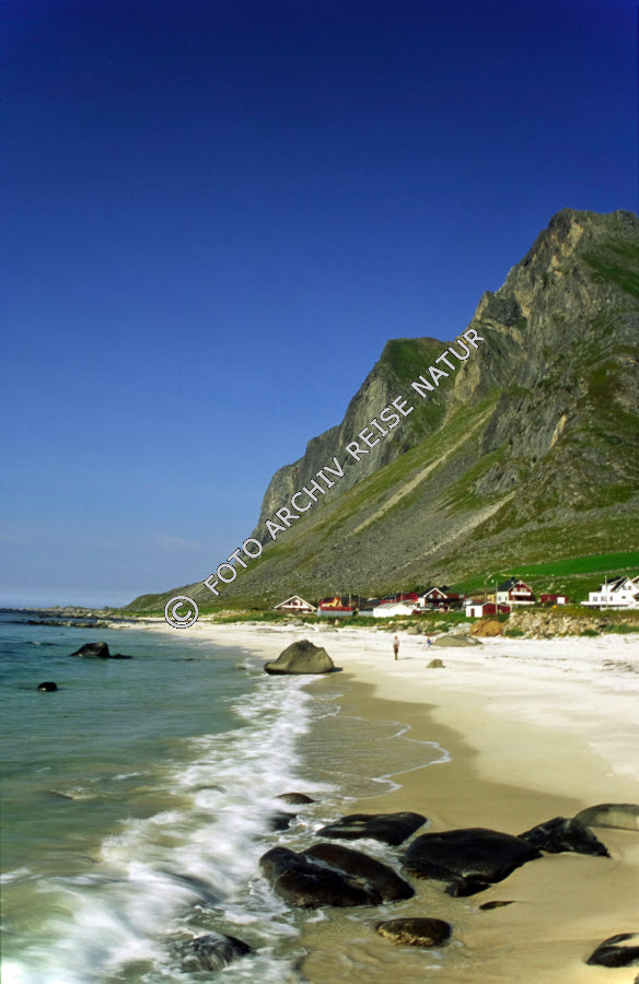 Berg, Brandungsgeröll, Dorf, Felsen, Geröll, Gewässer, Hamnøy, Kulturlandschaft, Landschaft, Lofoten, Material, Meer, Moskenesøy, Nordland, Nordmeer, Norwegen, Sandstrand, Stein, Strand, Weiler,