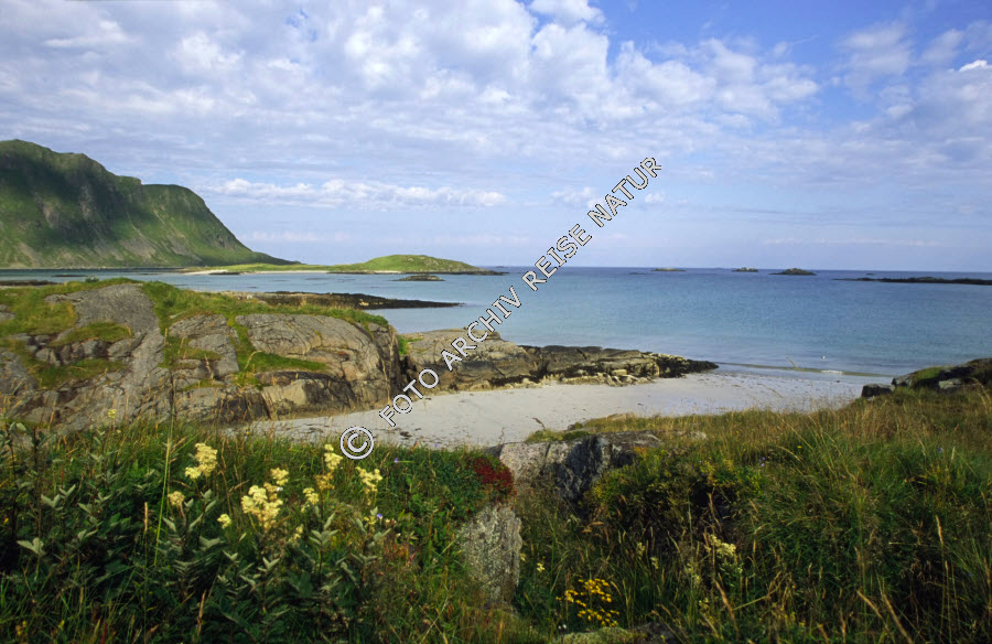 Berg, Berghang, Blume, Echtes Mädesüß, Filipendula ulmaria, Felsen, Flora, Fredvang, Gewässer, Gras, Grasbüschel, Landschaft, Lofoten, Material, Meer, Moskenesøy, Nordland, Nordmeer, Norwegen, Rosengewächs, Stein,