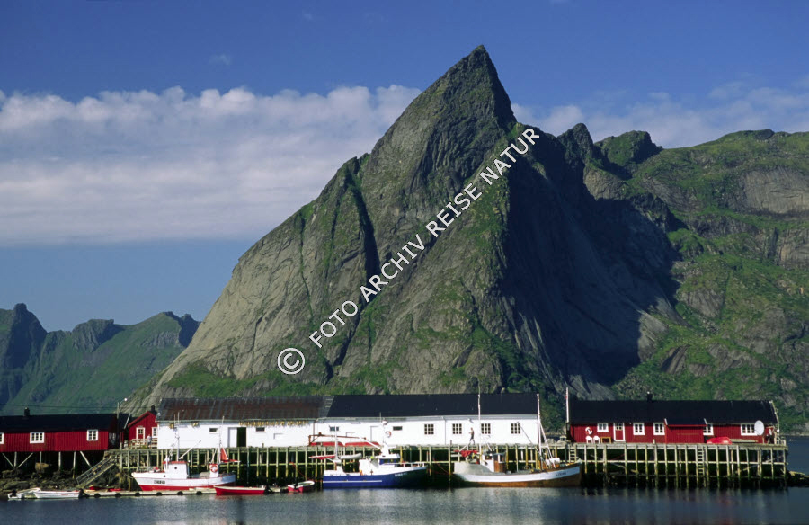 Keywords: Bauwerk, Berg, Fischereihafen, Fjord, Gewässer, Hafen, Hamnøy, Landschaft, Lofoten, Moskenesøy, Nordland, Norwegen, Vorfjorden,