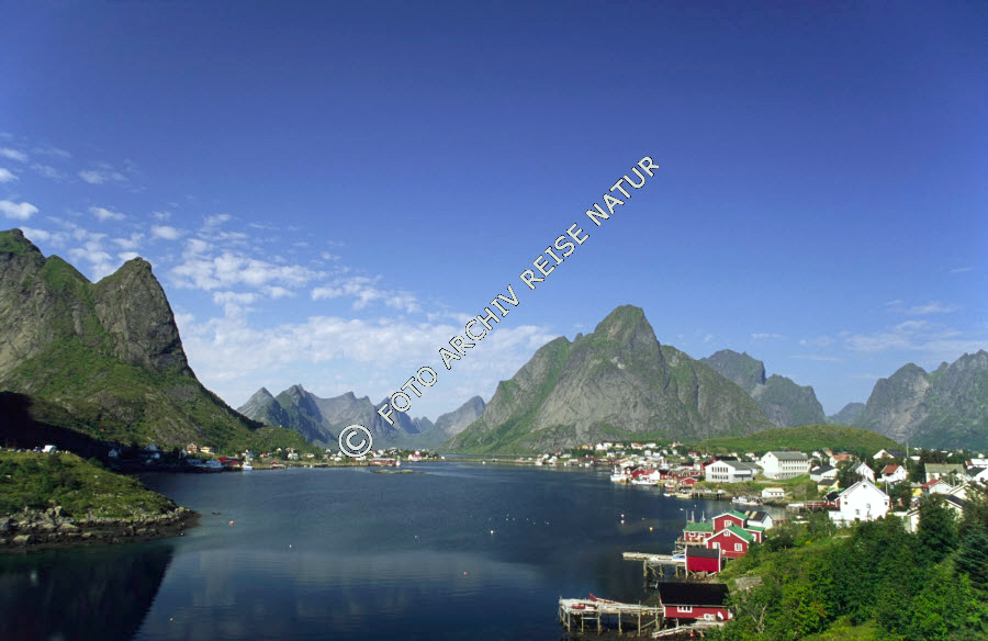 Berg, Berghang, Bergkette, Dorf, Fischerdorf, Fjord, Gebirge, Gewässer, Kulturlandschaft, Landschaft, Lofoten, Moskenesøy, Nordland, Norwegen, Reine, Reinefjorden,