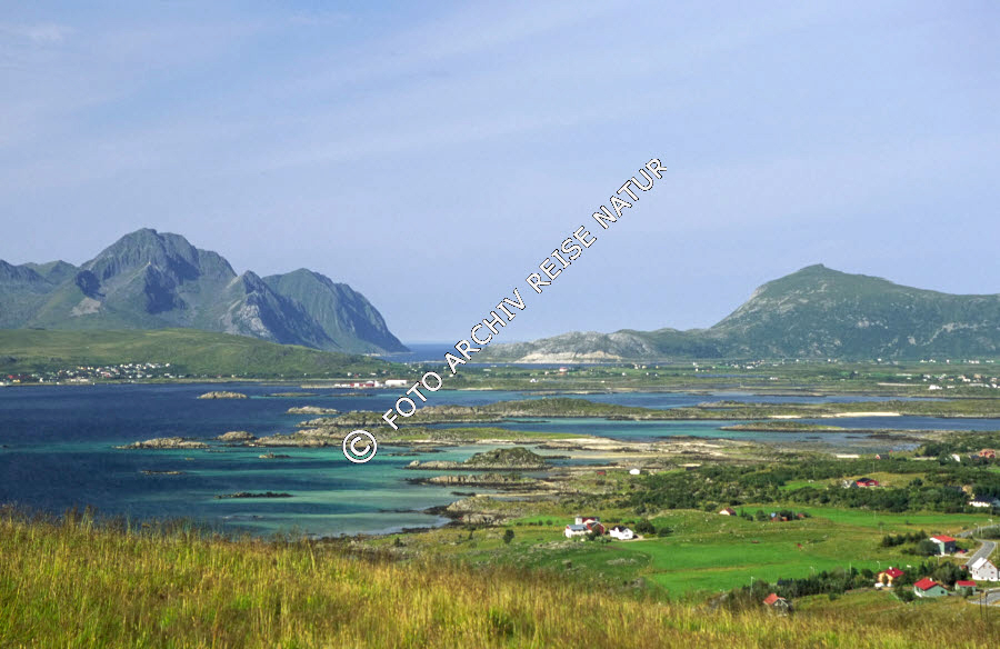 Berg, Buksnesfjorden, Dorf, Fjord, Gewässer, Kulturlandschaft, Landschaft, Lofoten, Nordland, Norwegen, Ramsvika, Vestvågøy, Weiler, Wiese,