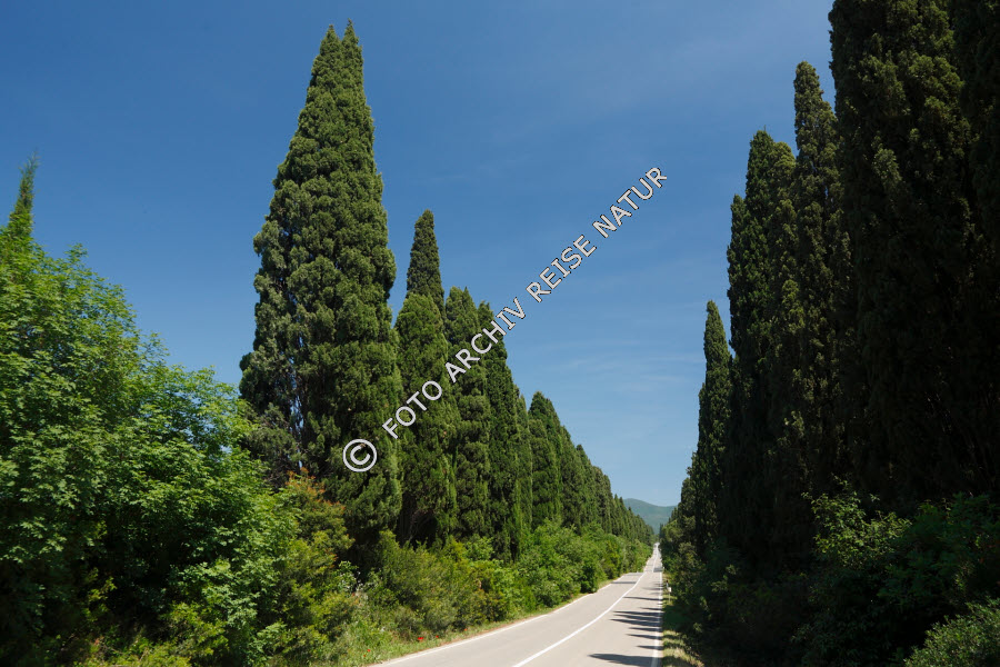 Allee, Baum, Bauwerk, Bolgheri, Flora, Italien, Marina di Bibbona, Straße, Toskana, Verkehrsweg, Zypresse, Cupressus, Zypressengewächs,