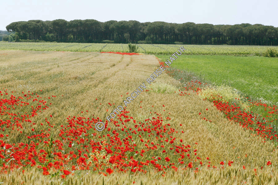 Baum, Blume, Bolgheri, Farbe, Feld, Flora, Italien, Kieferngewächs, Klatschmohn, Papaver rhoeas, Kornfeld, Kulturlandschaft, Marina di Bibbona, Mohngewächs, Pinie, Pinus pinea, Toskana, Weizenfeld, rot,