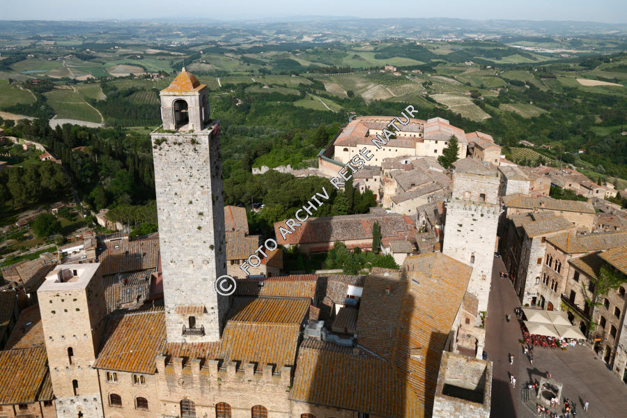 Altstadt, Bauwerk, Feld, Hügel, Hügelland, Italien, Kulturlandschaft, Landschaft, Rathausturm, San Gimignano, Stadt, Toskana, Turm,