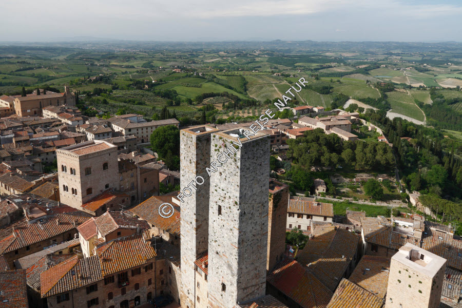 Altstadt, Bauwerk, Feld, Geschlechterturm, Hügel, Hügelland, Italien, Kulturlandschaft, Landschaft, San Gimignano, Stadt, Toskana, Turm,
