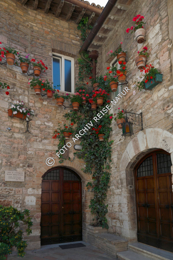 Altstadt, Assisi, Blume, Blumenschmuck, Blumentopf, Efeu, Hedera helix, Flora, Gebäudeteil, Geranie, Hauseingang, Italien, Kletterpflanze, Kulturlandschaft, Stadt, Storchschnabelgewächs, Tür, Umbrien,