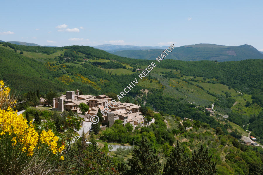 Berg, Bergdorf, Berghang, Besenginster, Cytisus scoparius, Blütenstrauch, Dorf, Flora, Hügel, Hügelland, Italien, Kulturlandschaft, Landschaft, Monte Subasio, Strauch, Umbrien,