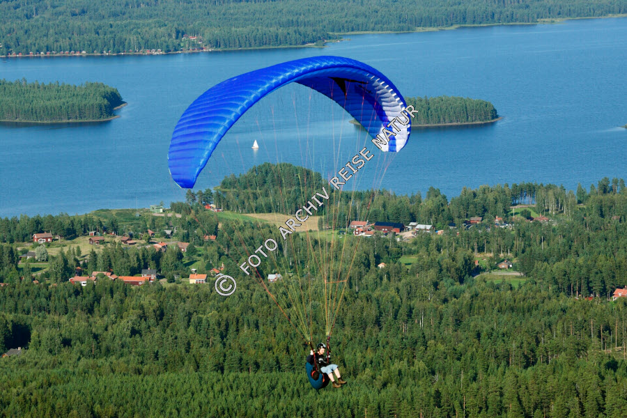 Aktivität, Dalarna, Ereignis, Freizeit, Freizeitsportler, Gesunda, Gesundaberget, Gewässer, Gleitschirmfliegen, Insel, Landschaft, Mora, Person, Schweden, See, Siljan, Sportler, Wald,