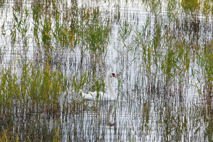 Dalarna, Entenvögel, Fauna, Flachwasserzone, Flora, Gewässer, Gras, Höckerschwan, Cygnus olor, Landschaft, Schilfrohr , Phragmites australis, Schweden, See, Siljan, Sollerön, Süßgras, Vogel,