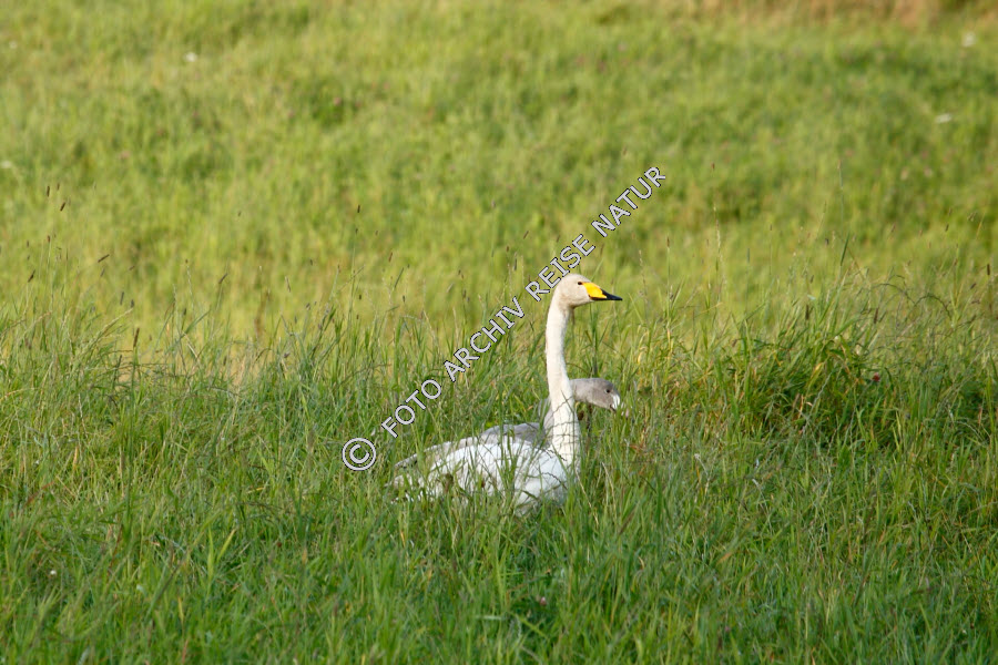 Singschwan mit Jungem auf einer Wiese