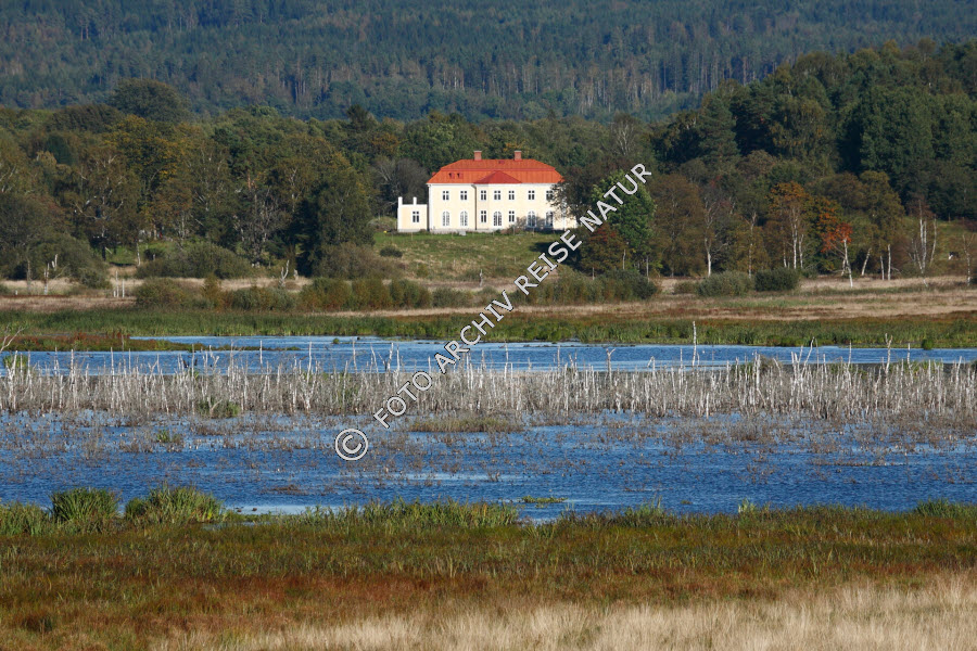 Bauwerk, Flachwasserzone, Gebäude, Gewässer, Gutshaus, Herrenhaus, Hornborgasjön, Landschaft, Naturschutzgebiet, Ort, Schweden, See, Västra Götlands län,