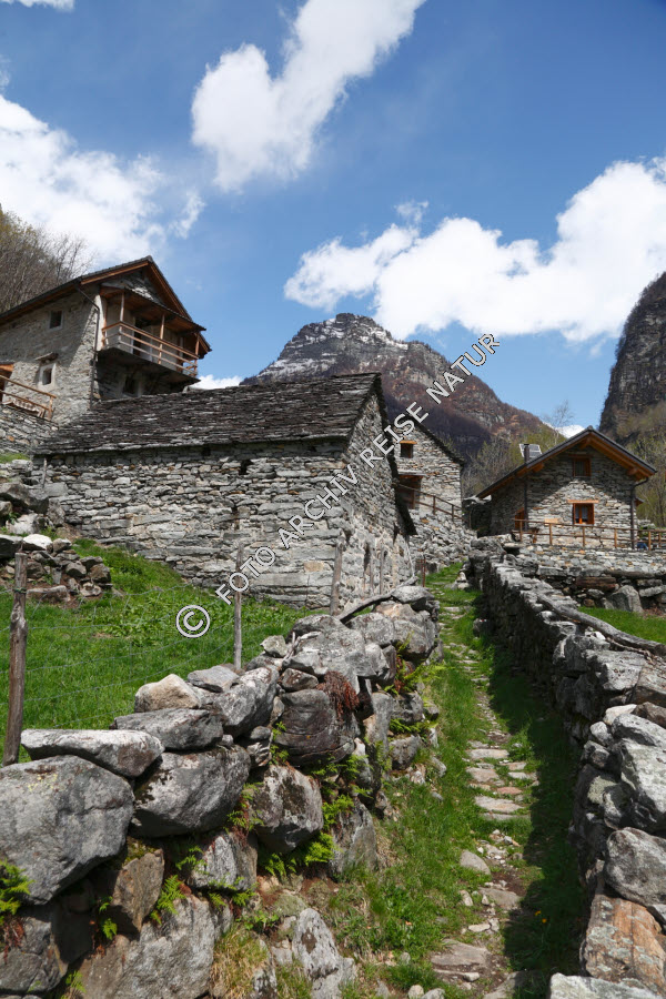 Alm, Bauwerk, Berghütte, Flora, Gebäude, Granit, Granitmauer, Gras, Haus, Hütte, Kulturlandschaft, Landschaft, Material, Mauer, Naturstein, Natursteinhaus, Natursteinmauer, Schweiz, Stein, Tessin, Verkehrsweg, Wanderweg, Weg, Weide, Wetter, Klima, Wolke,