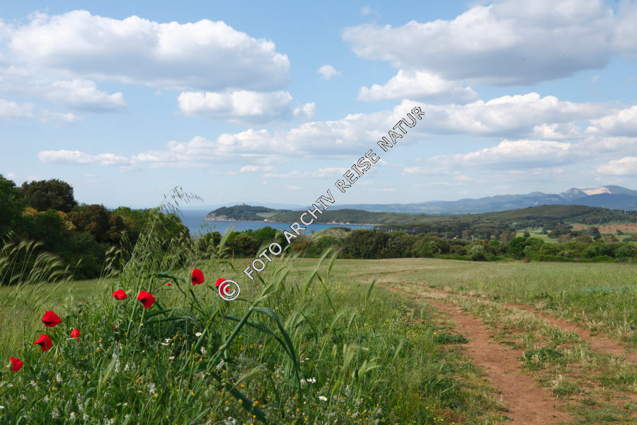 Bauwerk, Blume, Ethnologie, Etrusker, Feldweg, Flora, Gewässer, Golf von Baratti, Gras, Italien, Klatschmohn, Papaver rhoeas, Kultur, Kulturlandschaft, Landschaft, Ligurisches Meer, Mittelmeer, Mohngewächs, Strauch, Toskana, Verkehrsweg, Volk, Wald, Weg, Wetter, Klima, Wiese, Wissenschaft, Wolke,
