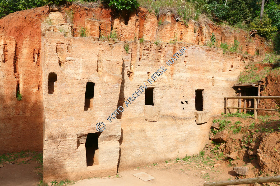Ethnologie, Etrusker, Felsen, Felswand, Flora, Friedhof, Grab, Höhlengrab, Italien, Kultur, Material, Nekropole, Ort, Stein, Strauch, Toskana, Volk, Wissenschaft,