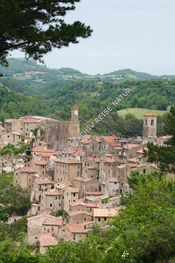 Bauwerk, Feld, Flora, Gebäude, Gegenstand, Haus, Hügel, Hügelland, Italien, Kirchturm, Kulturlandschaft, Landschaft, Material, Naturstein, Natursteinhaus, Sorano, Stadt, Stadtansicht, Stein, Strauch, Toskana, Tuff, Turm, Turmuhr, Uhr, Wald,