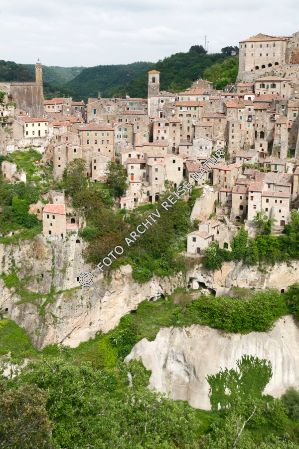 Bauwerk, Felsen, Flora, Gebäude, Haus, Italien, Kirche, Kirchturm, Kulturlandschaft, Landschaft, Material, Naturstein, Natursteinhaus, Sakralbau, Sorano, Stadt, Stadtansicht, Stein, Strauch, Toskana, Tuff, Turm, Wald,