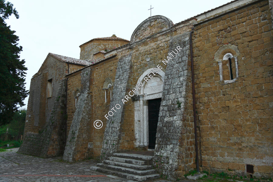 Baustil, Bauwerk, Dom, Fassade, Gebäude, Gebäudeteil, Gegenstand, Italien, Kirche, Kirchenfassade, Kreuz, Material, Naturstein, Portal, Romanik, Sakralbau, Sovana, Stein, Steintreppe, Stufenportal, Toskana, Treppe, Tuff, Vorromanik,