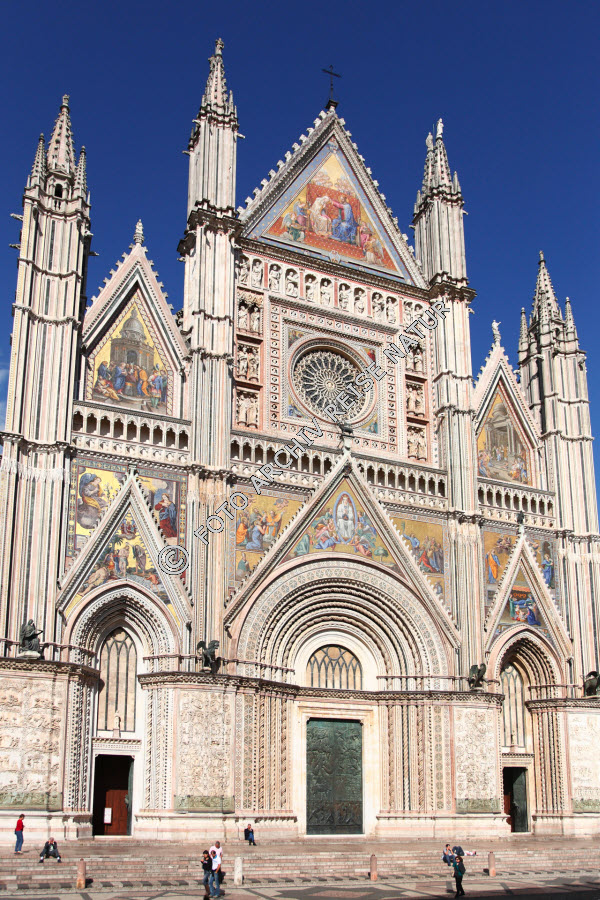 Bauwerk, Bronzetür, Dom, Fassade, Fenster, Fensterrose, Galerie, Gebäude, Gebäudeteil, Himmel, Italien, Kirche, Kirchenfassade, Kultur, Kunst, Mosaik, Orvieto, Pfeiler, Portal, Relief, Sakralbau, Skulptur, Sockel, Strebepfeiler, Stufenportal, Tür, Umbrien, Wimperg,