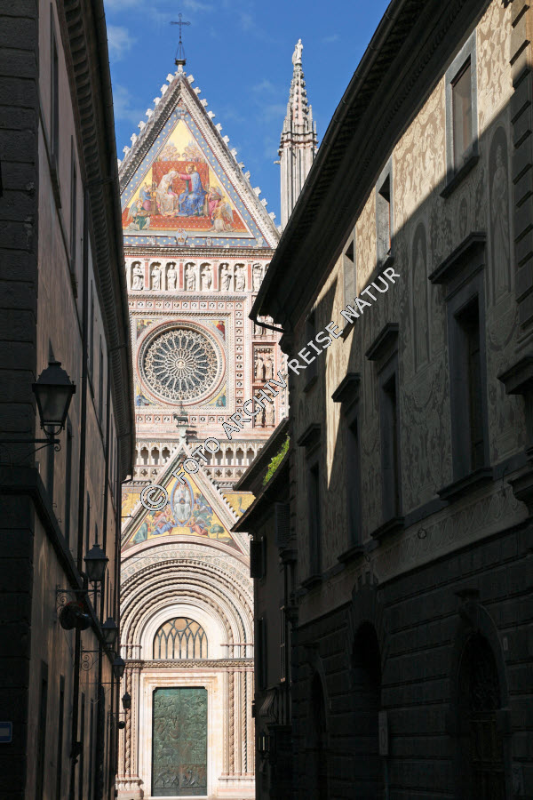 Bauwerk, Bronzetür, Dom, Fenster, Fensterrose, Gasse, Gebäude, Gebäudeteil, Haus, Italien, Kirche, Kultur, Kunst, Mosaik, Orvieto, Portal, Sakralbau, Skulptur, Steinskulptur, Straße, Stufenportal, Tür, Umbrien, Verkehrsweg, Wimperg,