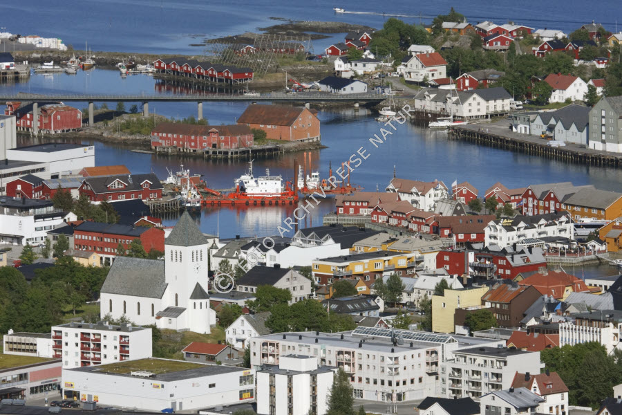 Austvågøya, Bauwerk, Berg, Brücke, Fjord, Gebäude, Gegenstand, Gestell, Gewässer, Hafen, Haus, Holzhaus, Kirche, Kulturlandschaft, Landschaft, Lofoten, Nordland, Norwegen, Sakralbau, Schiffswerft, Stadt, Stadtansicht, Steinhaus, Steinkirche, Stockfisch-Trockengestell, Svolvær, Tjeldbergtinden, Verkehrsweg, Vestfjorden,