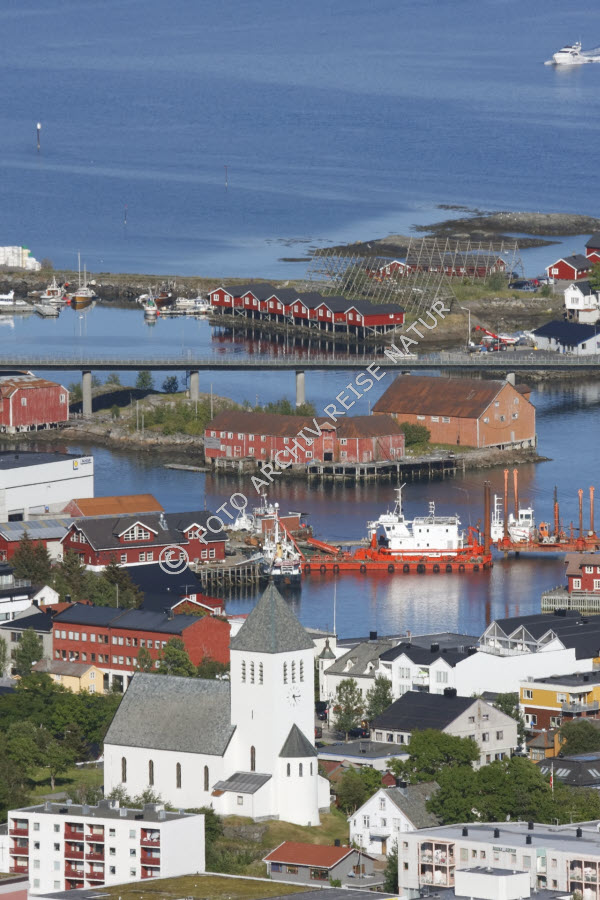 Keywords: Austvågøya, Bauwerk, Berg, Fjord, Gebäude, Gegenstand, Gestell, Gewässer, Hafen, Haus, Holzhaus, Kirche, Kulturlandschaft, Landschaft, Lofoten, Nordland, Norwegen, Sakralbau, Schiffswerft, Stadt, Steinhaus, Steinkirche, Stockfisch-Trockengestell, Svolvær, Tjeldbergtinden, Vestfjorden,