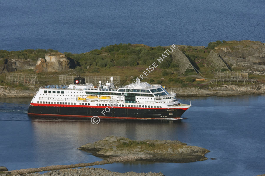 Hurtigrutenschiff bei der Ausfahrt aus dem Hafen von Svolvær