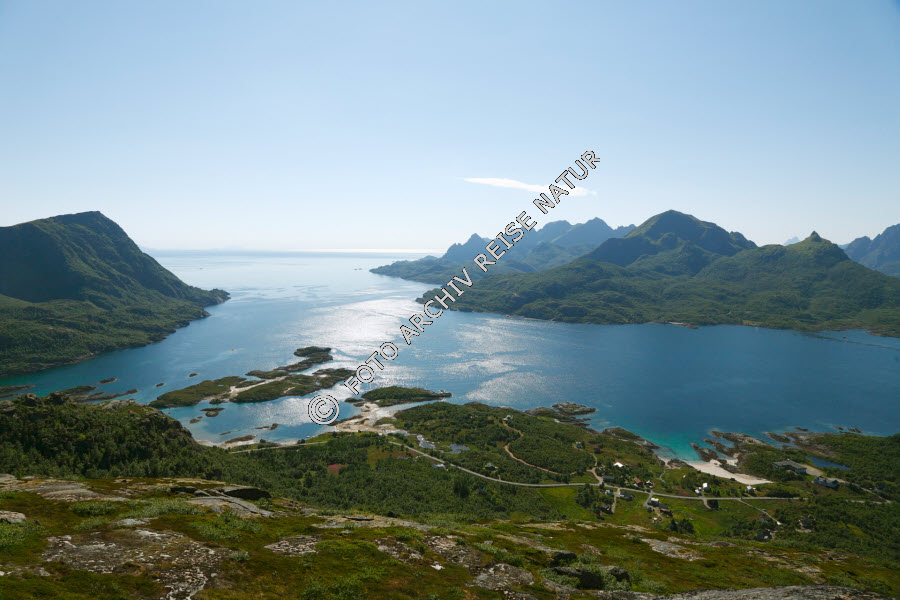 Bauwerk, Berg, Digermulen, Fjord, Gewässer, Hinnøya, Insel, Landschaft, Lofoten, Nordland, Norwegen, Stormolla, Straße, Sund, Süd-Hinnøy, Ulvågsund, Verkehrsweg, Vestfjorden, Wald,