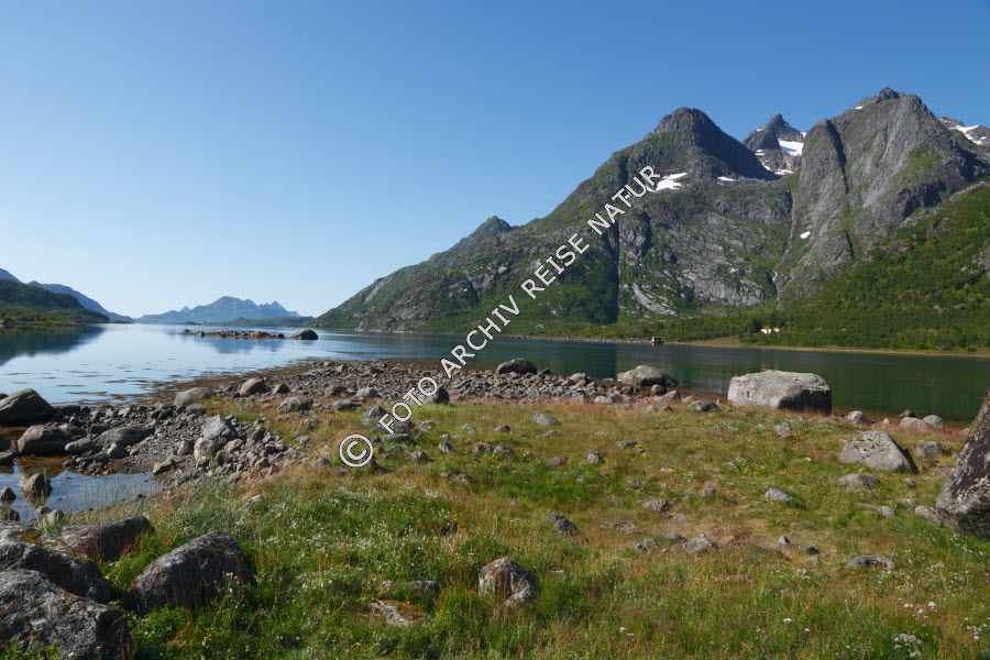 Bergkette, Bergmassiv, Felsblock, Felsen, Felswand, Flora, Gebirge, Geröll, Gewässer, Gras, Landschaft, Material, Nord-Austvågøy, Nordland, Norwegen, Raften, Raftsundet, Stein, Sund, Vesterålen,