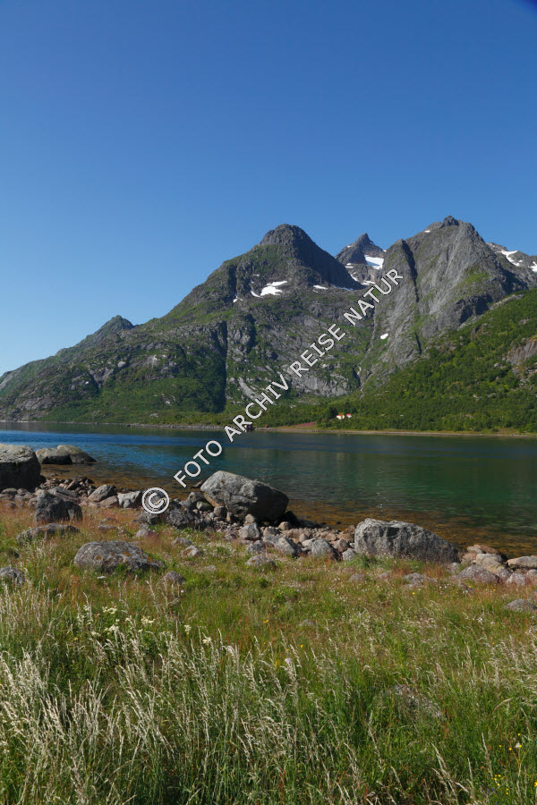 Bergkette, Bergmassiv, Felsblock, Felsen, Felswand, Flora, Gebirge, Geröll, Gewässer, Gras, Landschaft, Material, Nord-Austvågøy, Nordland, Norwegen, Raften, Raftsundet, Stein, Sund, Vesterålen,