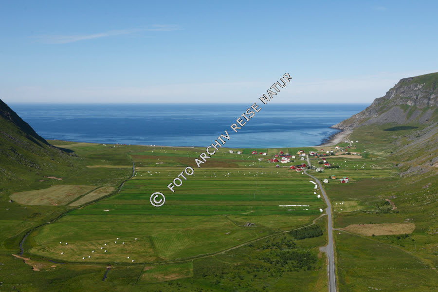 Bach, Berg, Berghang, Bucht, Dorf, Gewässer, Kulturlandschaft, Landschaft, Lofoten, Meer, Nordland, Nordmeer, Norwegen, Unnstad, Vestvågøy, Weide, Weiler,