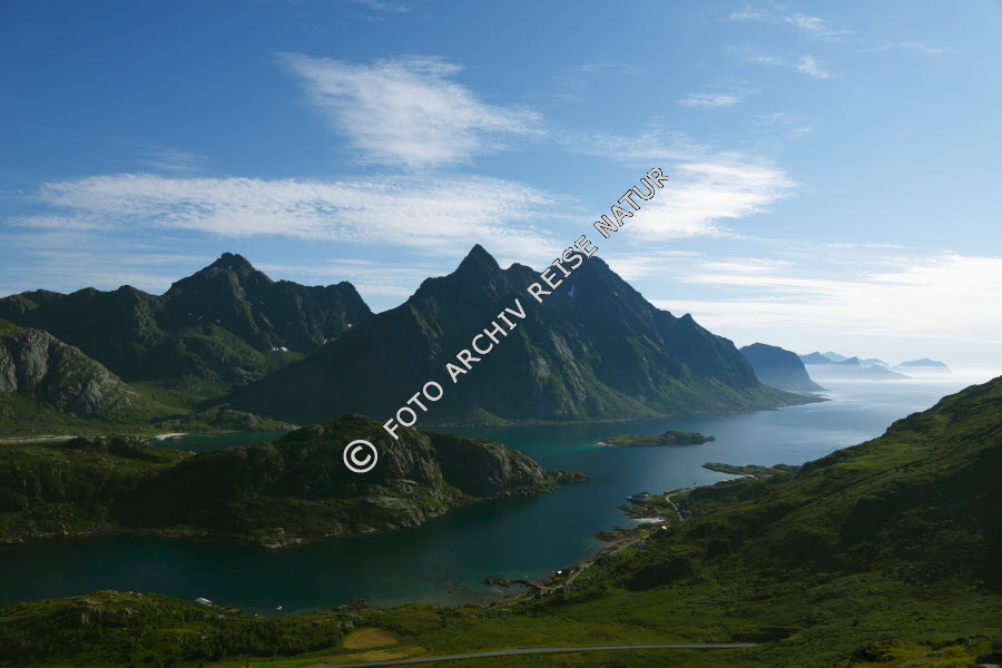 Bauwerk, Berg, Berghang, Dorf, Fjord, Gewässer, Insel, Kulturlandschaft, Landschaft, Lofoten, Nebel, Nebelschlei, Nordland, Norwegen, Steinsfjorden, Straße, Unnstad, Verkehrsweg, Vestvågøy, Weiler, Wetter, Klima, Wolke,