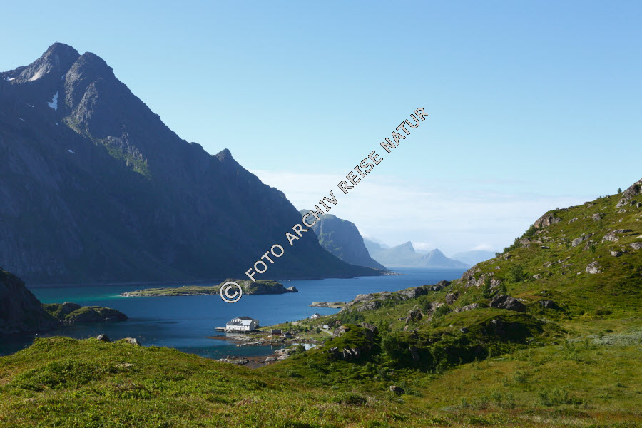 Bauwerk, Berg, Berghang, Dorf, Felsen, Felswand, Fjord, Flora, Gewässer, Gras, Insel, Kulturlandschaft, Landschaft, Lofoten, Material, Mærvoll, Nordland, Norwegen, Stein, Steinsfjorden, Straße, Verkehrsweg, Vestvågøy, Weiler,
