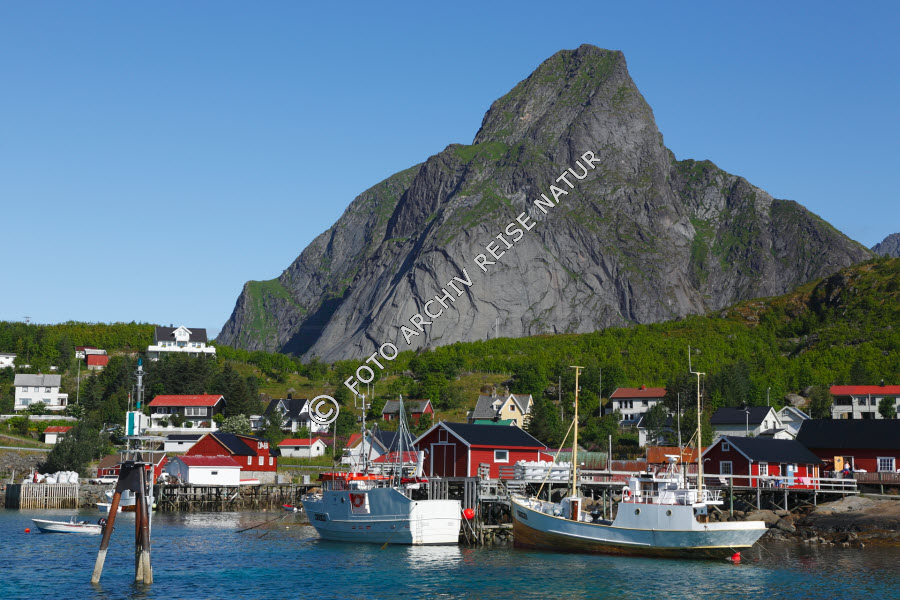 Keywords: Bauwerk, Berg, Dorf, Felsen, Felswand, Fischerdorf, Fjord, Gebäude, Gewässer, Hafen, Holzhütte, Hütte, Kulturlandschaft, Landschaft, Lofoten, Material, Moskenesøy, Nordland, Norwegen, Reine, Reinefjorden, Stein, Wald,