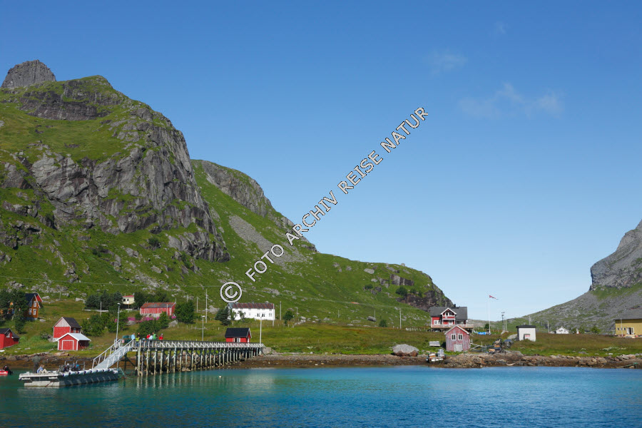 Bauwerk, Berg, Bootsanleger, Dorf, Fjord, Forsfjorden, Gewässer, Kulturlandschaft, Landschaft, Lofoten, Moskenesøy, Nordland, Norwegen, Vindstad, Weiler,