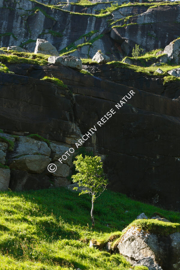 Baum, Felsen, Flora, Gras, Lofoten, Material, Moskenesøy, Nordland, Norwegen, Stein, Vindstad,