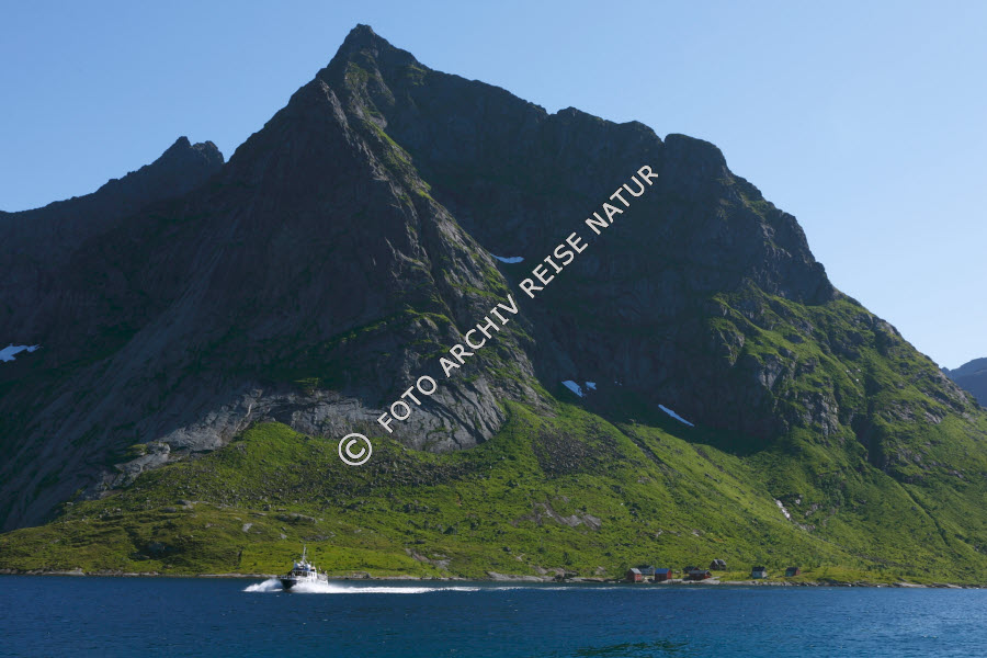 Berg, Fjord, Forsfjorden, Gewässer, Landschaft, Lofoten, Moskenesøy, Nordland, Norwegen, Vindstad,