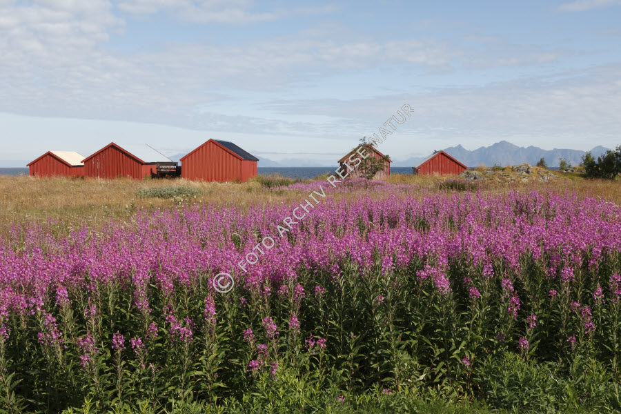 Austvågøya, Bauwerk, Blume, Fischerhütte, Flora, Gebäude, Gewässer, Hütte, Landschaft, Lofoten, Meer, Nachtkerzengewächs, Nordland, Nordmeer, Norwegen, Schmalblättriges Weidenröschen, Epilobium angustifolium, Straumnes, Wildpflanze,
