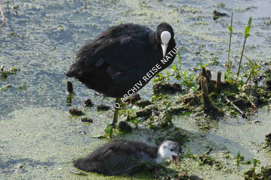 Blässhuhn mit Jungtier am Hornborgasjön bei Fågeludden