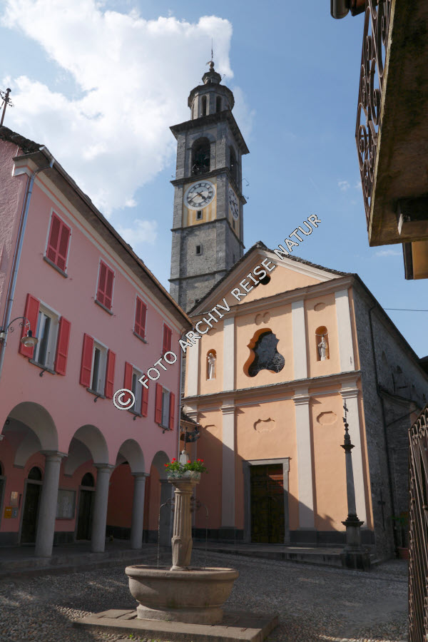Arkaden, Bauwerk, Brunnen, Gebäude, Gebäudeteil, Haus, Himmel, Intragna, Kirche, Kirchplatz, Kirchturm, Kopfsteinpflaster, Kulturlandschaft, Material, Platz, Sakralbau, Schweiz, Stadt, Stein, Steinkirche, Tessin, Turm, Wasser, Wetter, Klima, Wolke,