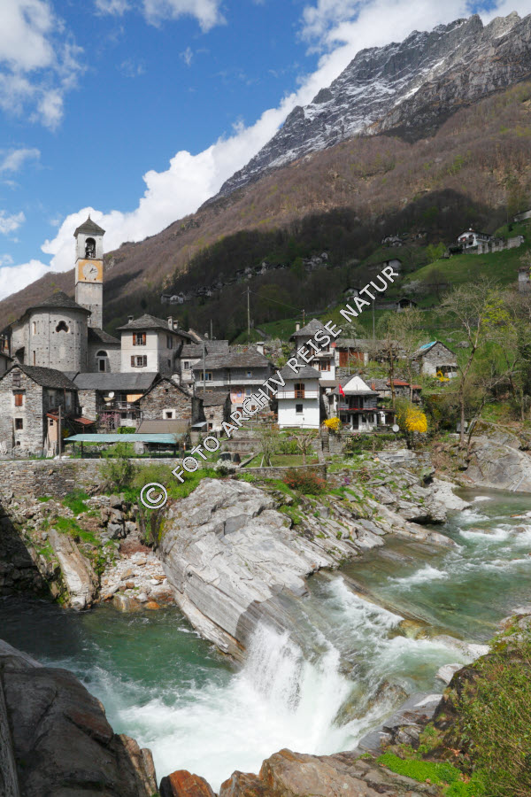Bach, Bauwerk, Bergkette, Bergmassiv, Dorf, Felsen, Gebirge, Gebirgsbach, Gebäude, Gewässer, Kirche, Kirchturm, Kulturlandschaft, Landschaft, Lavertezzo, Material, Sakralbau, Schweiz, Stein, Steinkirche, Tessin, Turm, Val Verzasca,