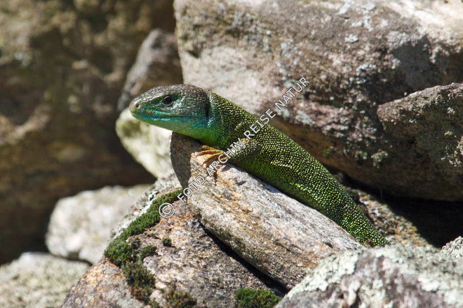 Bauwerk, Eidechse, Fauna, Granitmauer, Mauer, Natursteinmauer, Reptil, Schweiz, Smaragdeidechse, Lacerta viridis, Sonogno, Tessin, Val Redòrta, Val Verzasca,